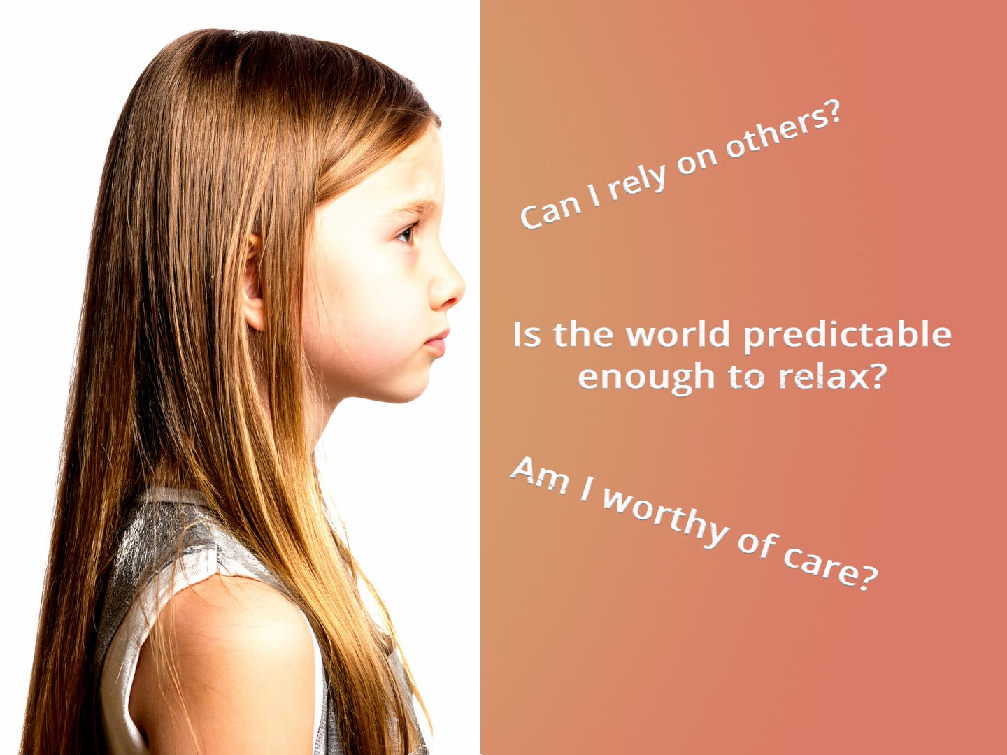 When children do not feel safe and secure, they expend energy trying to protect themselves from unknown dangers. Young children may become guarded, worried about disapproval and sudden changes, and remain constantly on alert, even when nothing is wrong. Later in life, as adolescents, they may internalize this insecurity, which can affect their self-esteem and how they relate to others. At any age, children without a sense of inner peace will be distracted from learning or connecting with others, as they shift into a state of vigilance and short-term survival mode.
